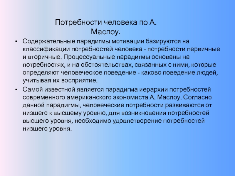 Слайд 3Содержательные парадигмы мотивации базируются на классификации потребностей человека - потребности