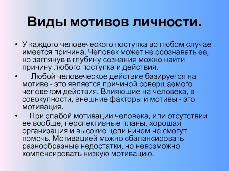 Любой человеческое действие базируется на мотиве - это является причиной совершаемого человеком действия. Влияющие на человека, в совокупности, внешние факторы и мотивы - это мотивация.