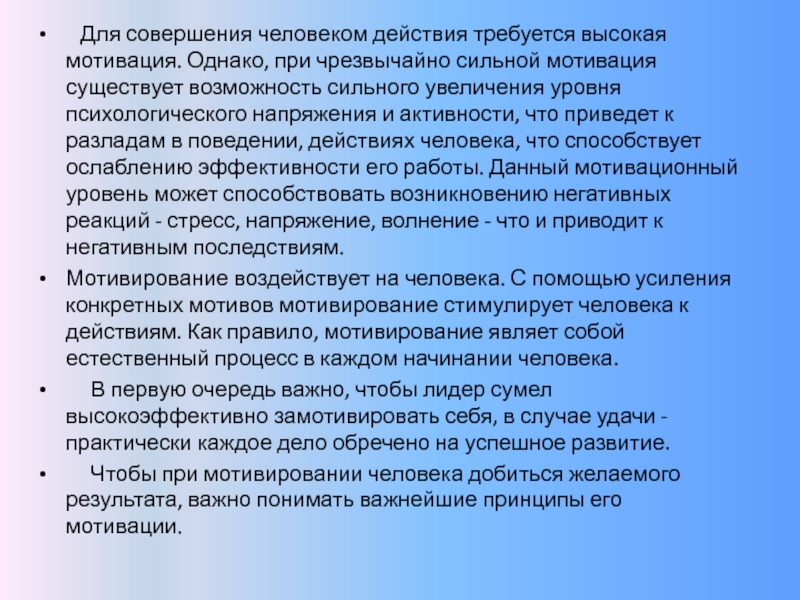 Слайд 11 Для совершения человеком действия требуется высокая мотивация. Однако, при