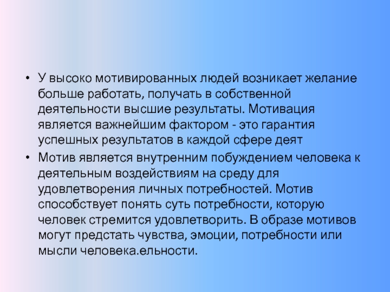 Слайд 7У высоко мотивированных людей возникает желание больше работать, получать в