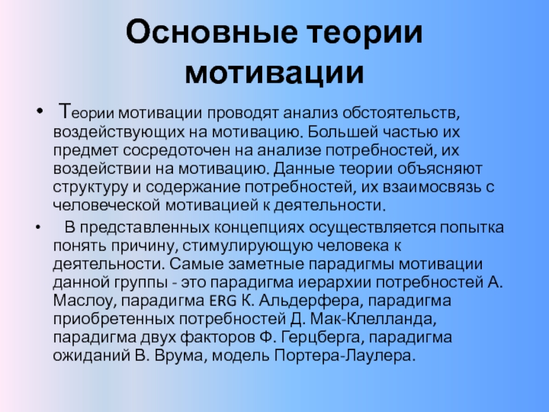 Теории мотивации проводят анализ обстоятельств, воздействующих на мотивацию.