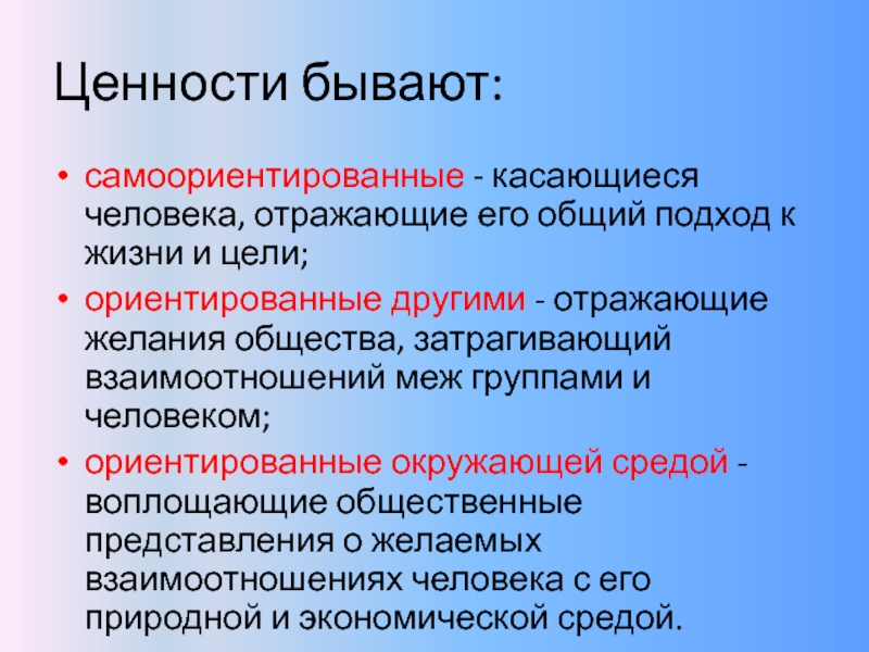 ориентированные окружающей средой - воплощающие общественные представления о желаемых взаимоотношениях человека с его природной и экономической средой.