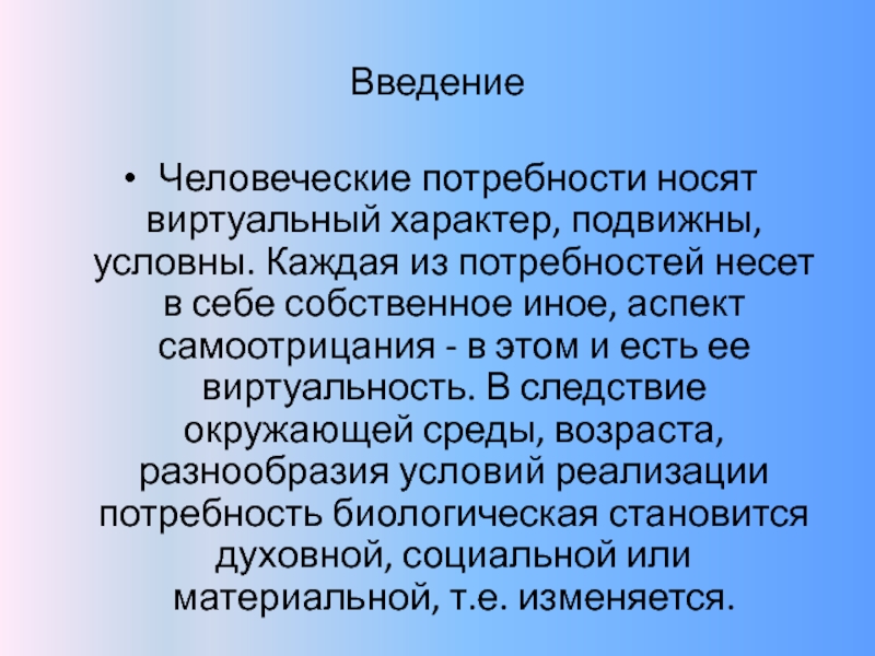 Человеческие потребности носят виртуальный характер, подвижны, условны. Каждая из потребностей
