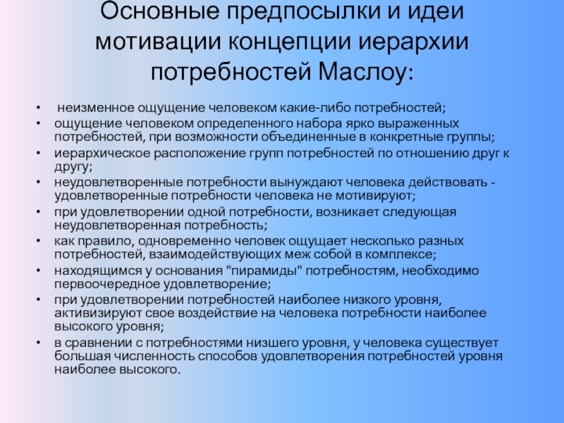 Слайд 5Основные предпосылки и идеи мотивации концепции иерархии потребностей Маслоу: