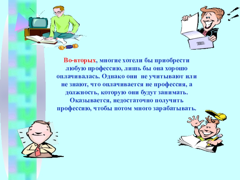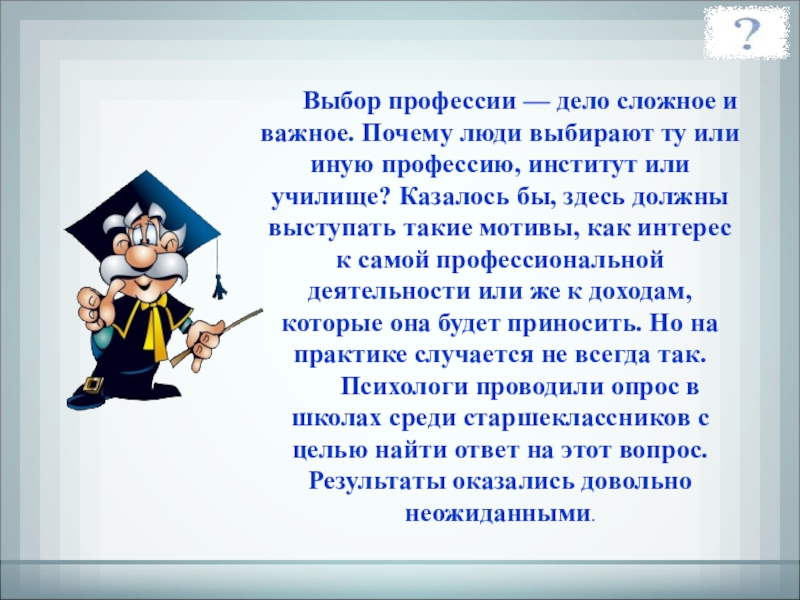 должны выступать такие мотивы, как интерес к самой профессиональной деятельности или же к доходам, которые она будет приносить. Но на практике случается не всегда так.Психологи проводили опрос в школах среди старшеклассников с целью найти ответ на этот вопрос. Результаты оказались довольно неожиданными.