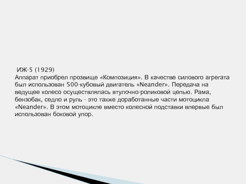 втулочно-роликовой цепью. Рама, бензобак, седло и руль - это также доработанные части мотоцикла «Neander». В этом мотоцикле вместо колесной подставки впервые был использован боковой упор.