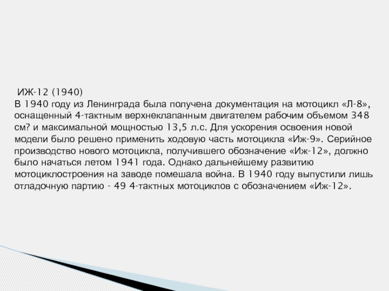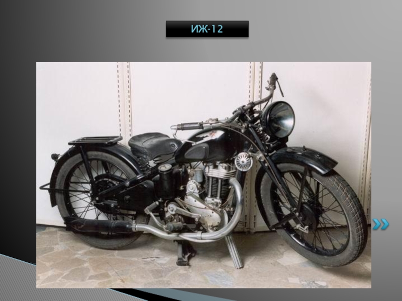 см? и максимальной мощностью 13,5 л.с. Для ускорения освоения новой модели было решено применить ходовую часть мотоцикла «Иж-9». Серийное производство нового мотоцикла, получившего обозначение «Иж-12», должно было начаться летом 1941 года. Однако дальнейшему развитию мотоциклостроения на заводе помешала война. В 1940 году выпустили лишь отладочную партию - 49 4-тактных мотоциклов с обозначением «Иж-12».