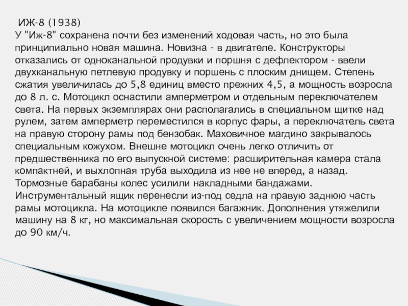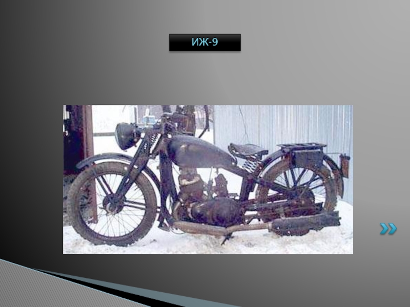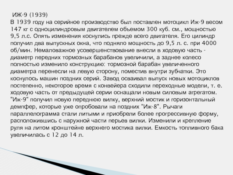 куб. см., мощностью 9,5 л.с. Опять изменения коснулись прежде всего двигателя. Его цилиндр получил два выпускных окна, что подняло мощность до 9,5 л. с. при 4000 об/мин. Немаловажное усовершенствование внесли в ходовую часть - диаметр передних тормозных барабанов увеличили, а заднее колесо полностью изменило конструкцию: тормозной барабан увеличенного диаметра перенесли на левую сторону, поместив внутри зубчатки. Это коснулось машин поздних серий. Завод осваивал выпуск новых мотоциклов постепенно, некоторое время с конвейера сходили переходные модели, т. е. ходовую часть от предыдущей серии оснащали новым силовым агрегатом. "Иж-9" получил новую переднюю вилку, верхний мостик и горизонтальный демпфер, которые уже опробовали на поздних "Иж-8". Рычаги параллелограмма стали литыми и приобрели более прогрессивную форму, расположившись с наружной части перьев вилки. Изменили и крепление руля на литом кронштейне верхнего мостика вилки. Емкость топливного бака увеличилась с 12 до 14 л.