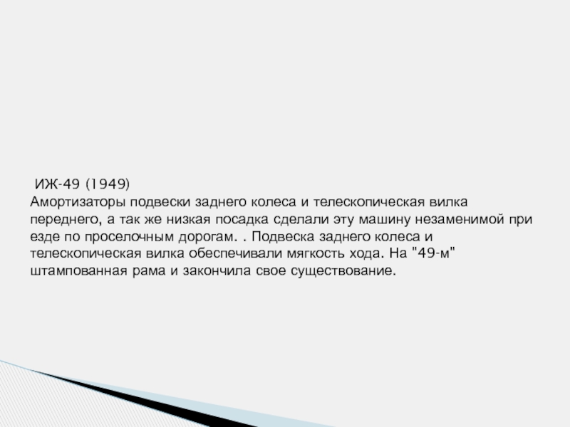 езде по проселочным дорогам. . Подвеска заднего колеса и телескопическая вилка обеспечивали мягкость хода. На "49-м" штампованная рама и закончила свое существование.