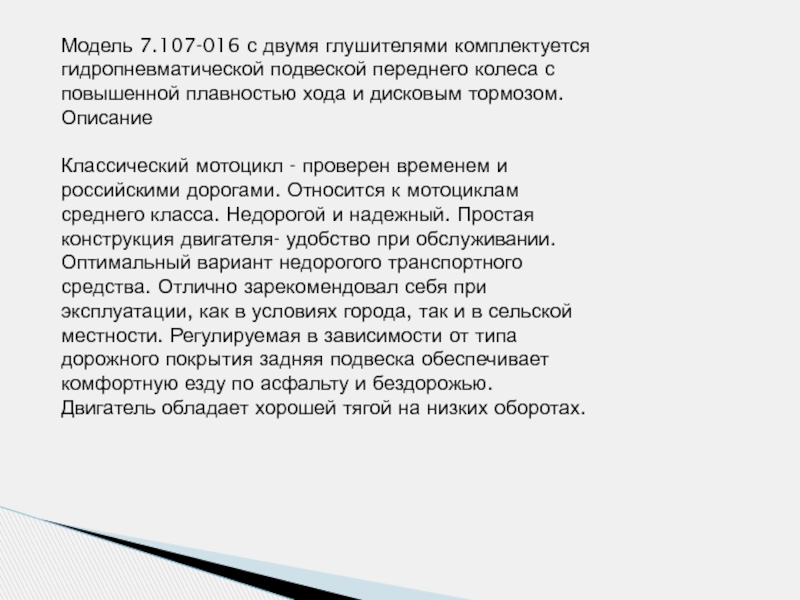 Слайд 53Модель 7.107-016 с двумя глушителями комплектуется гидропневматической подвеской переднего колеса