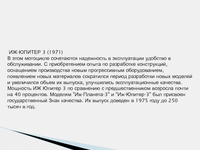 производства новым прогрессивным оборудованием, появлением новых материалов сократился период разработки новых моделей и увеличился объем их выпуска, улучшились эксплуатационные качества. Мощность ИЖ Юпитер 3 по сравнению с предшественником возросла почти на 40 процентов. Моделям "Иж-Планета-3" и "Иж-Юпитер-3" был присвоен государственный Знак качества. Их выпуск доведен в 1975 году до 250 тысяч в год.
