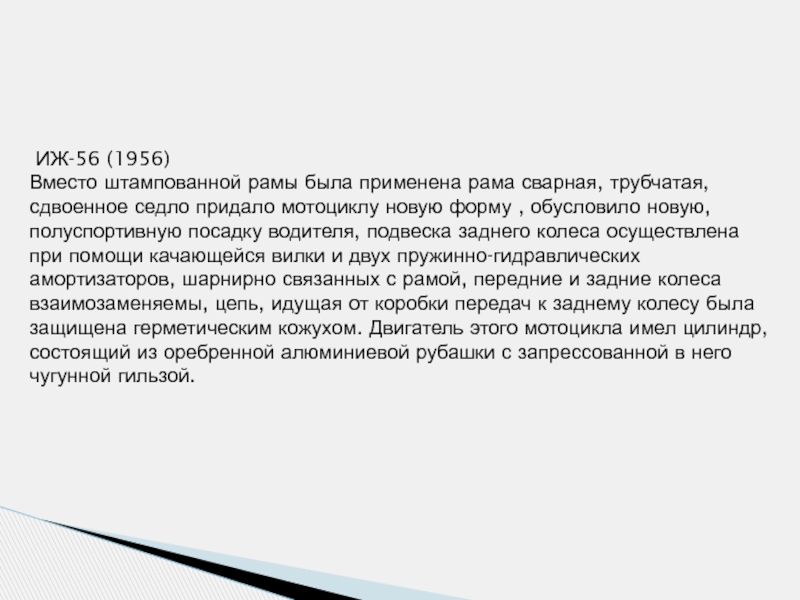 посадку водителя, подвеска заднего колеса осуществлена при помощи качающейся вилки и двух пружинно-гидравлических амортизаторов, шарнирно связанных с рамой, передние и задние колеса взаимозаменяемы, цепь, идущая от коробки передач к заднему колесу была защищена герметическим кожухом. Двигатель этого мотоцикла имел цилиндр, состоящий из оребренной алюминиевой рубашки с запрессованной в него чугунной гильзой.