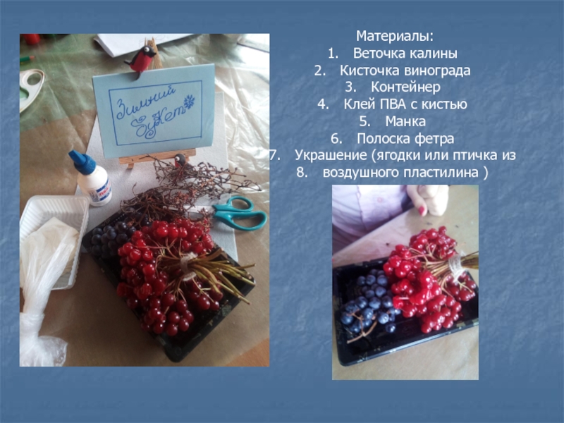 Материалы:Веточка калины Кисточка виноградаКонтейнерКлей ПВА с кистьюМанкаПолоска фетраУкрашение (ягодки или птичка извоздушного пластилина )