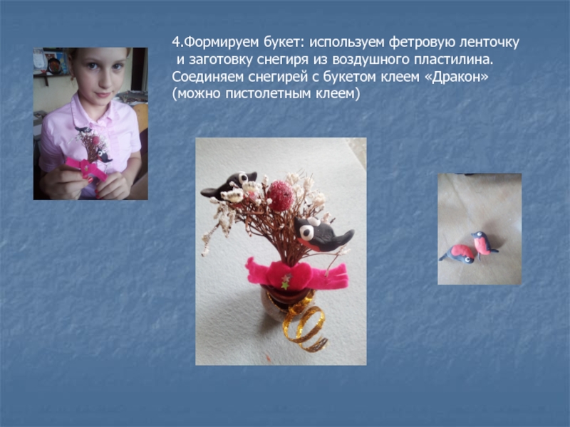 4.Формируем букет: используем фетровую ленточку и заготовку снегиря из воздушного пластилина.Соединяем снегирей с букетом клеем «Дракон» (можно