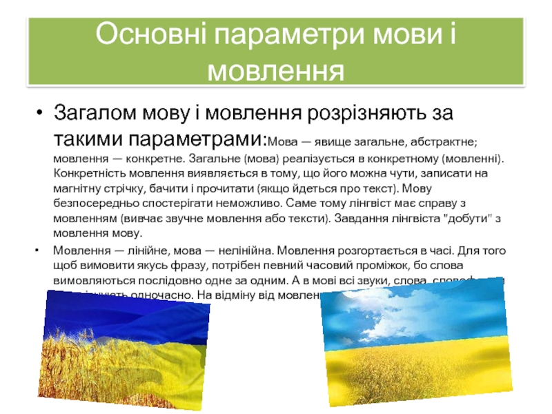 такими параметрами:Мова — явище загальне, абстрактне; мовлення — конкретне. Загальне
