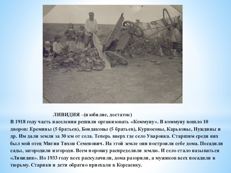 В 1918 году часть населения решили организовать «Коммуну». В коммуну вошло 10 дворов: Еремины (5 братьев), Бондяковы (5 братьев), Курносовы, Карьковы, Нуждины и др. Им дали земли за 30 км от села. Теперь вверх где село Уваровка. Старшим среди них был мой отец Мигин Тихон Семенович. На этой земле они построили себе дома. Посадили сады, загородили изгороди. Всем поровну распределили землю. И село стало называться «Ливидия». Но 1933 году всех раскулачили, дома разорили, а мужиков всех посадили в тюрьму. Старики и дети обратно приехали в Корсаевку.