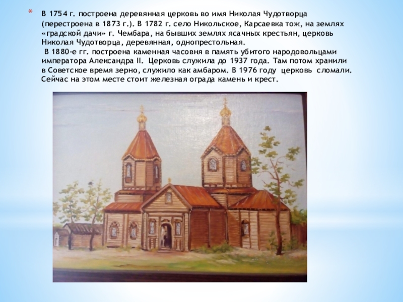 Слайд 3В 1754 г. построена деревянная церковь во имя Николая Чудотворца