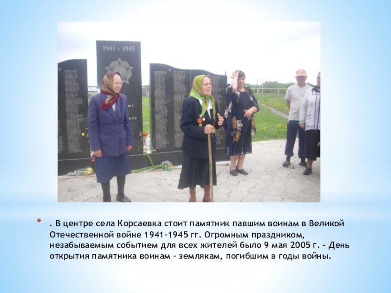 Слайд 5. В центре села Корсаевка стоит памятник павшим воинам в