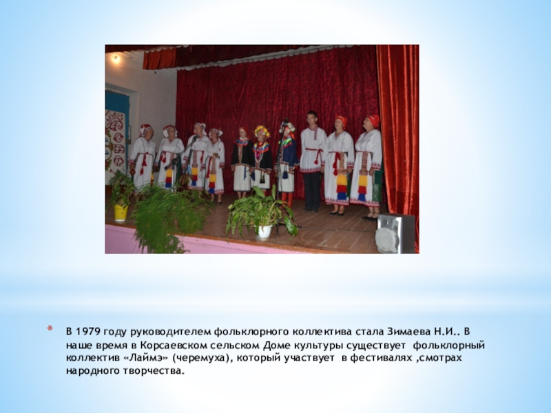Слайд 12В 1979 году руководителем фольклорного коллектива стала Зимаева Н.И.. В