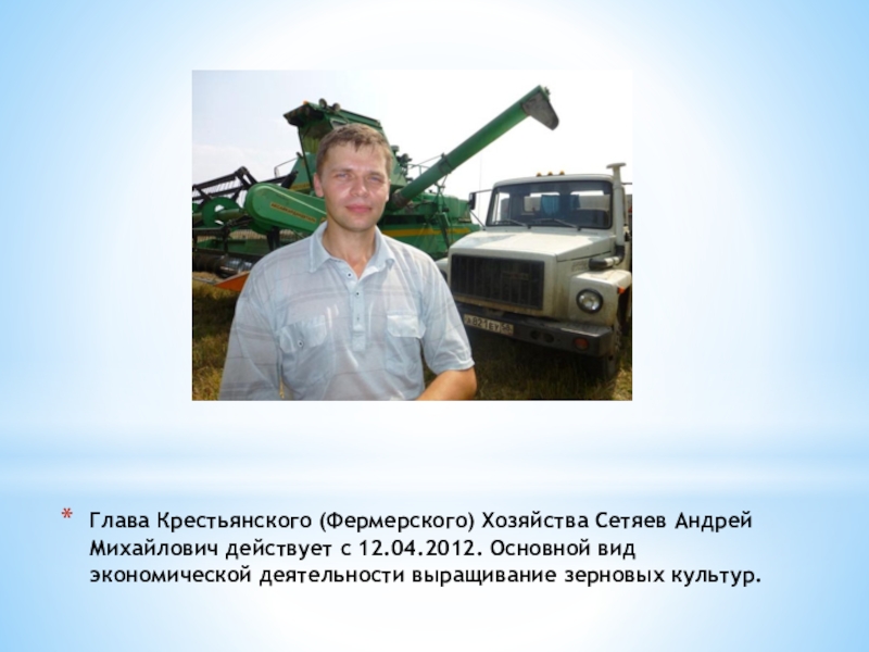 Слайд 10Глава Крестьянского (Фермерского) Хозяйства Сетяев Андрей Михайлович действует с 12.04.2012.