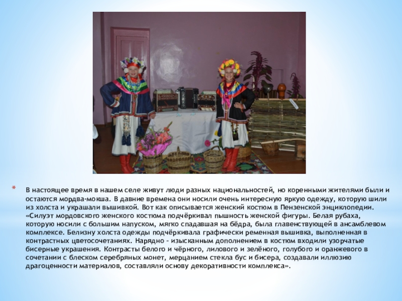 они носили очень интересную яркую одежду, которую шили из холста и украшали вышивкой. Вот как описывается женский костюм в Пензенской энциклопедии. «Силуэт мордовского женского костюма подчёркивал пышность женской фигуры. Белая рубаха, которую носили с большим напуском, мягко спадавшая на бёдра, была главенствующей в ансамблевом комплексе. Белизну холста одежды подчёркивала графически ременная вышивка, выполненная в контрастных цветосочетаниях. Нарядно – изысканным дополнением в костюм входили узорчатые бисерные украшения. Контрасты белого и чёрного, лилового и зелёного, голубого и оранжевого в сочетании с блеском серебряных монет, мерцанием стекла бус и бисера, создавали иллюзию драгоценности материалов, составляли основу декоративности комплекса».
