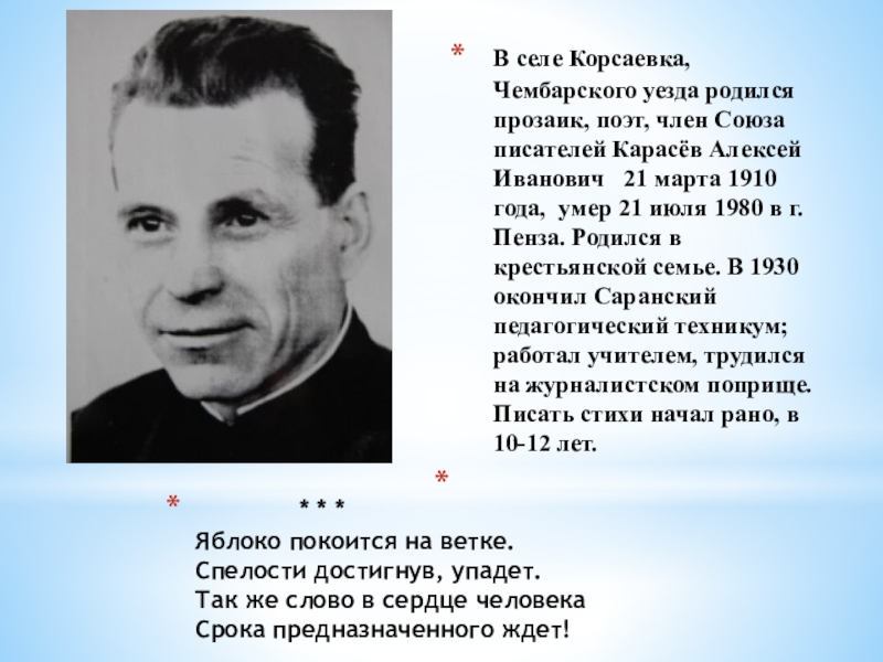 В селе Корсаевка, Чембарского уезда родился прозаик, поэт, член Союза писателей Карасёв Алексей Иванович 21 марта 1910 года, умер 21 июля 1980 в г. Пенза. Родился в крестьянской семье. В 1930 окончил Саранский педагогический техникум; работал учителем, трудился на журналистском поприще. Писать стихи начал рано, в 10-12 лет.