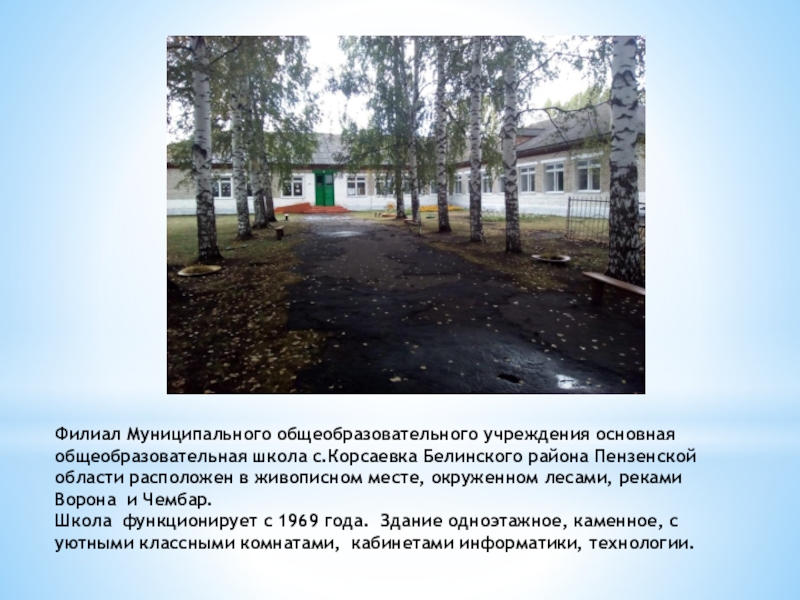 Слайд 8Филиал Муниципального общеобразовательного учреждения основная общеобразовательная школа с.Корсаевка Белинского района