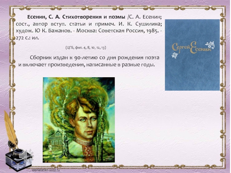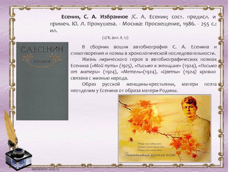 Есенин, С. А. Избранное /С. А. Есенин; сост. предисл. и примеч. Ю. Л. Прокушева. - Москва: Просвещение, 1986. - 255 с.: ил.