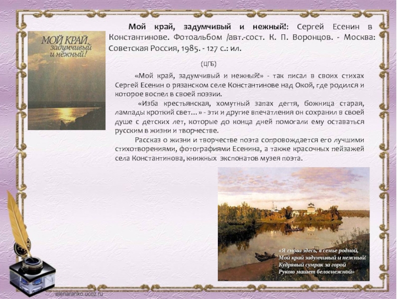 Мой край, задумчивый и нежный!: Сергей Есенин в Константинове. Фотоальбом /авт.-сост. К. П. Воронцов. - Москва: Советская Россия, 1985. - 127 с.: ил.