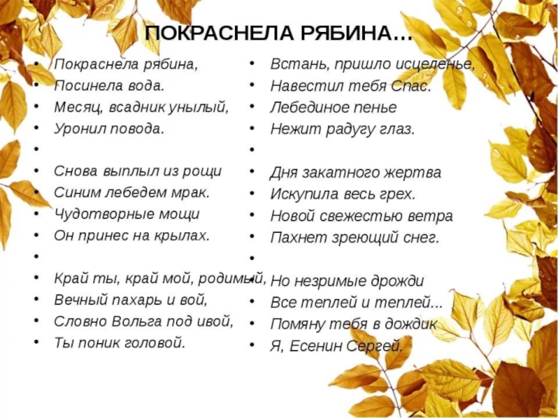 Как известно, любимым временем года у него была осень. Есенин преображает голые унылые рощи в звонкие прекрасные чащи, неприятные сырость и туман - в таинственную дымку, даёт нам возможность почувствовать, что мир полон чудес.