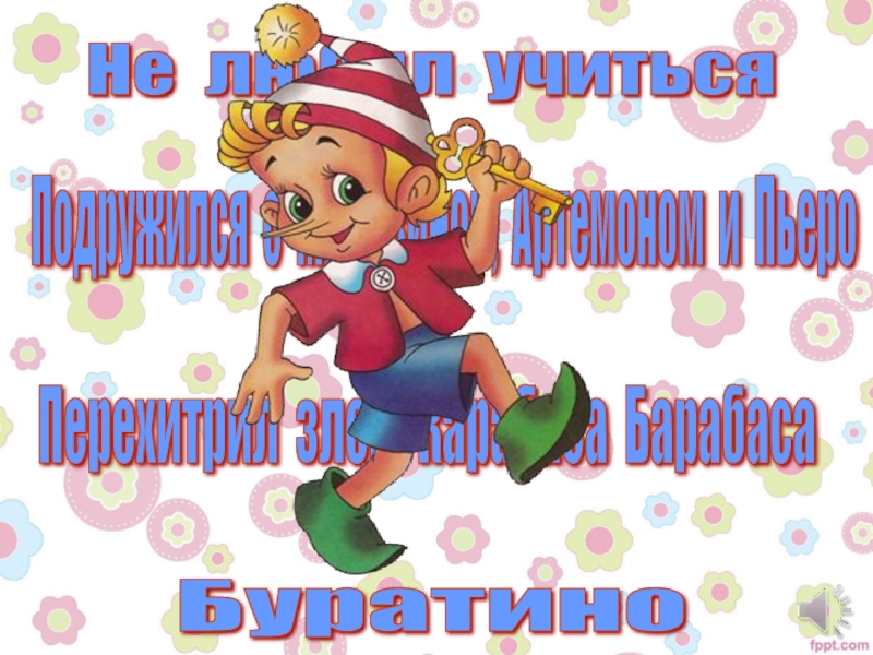 Не любил учиться Подружился с Мальвиной, Артемоном и Пьеро Перехитрил злого Карабаса Барабаса Буратино