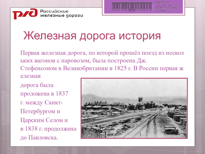 Первая железная дорога, по которой прошёл поезд из нескольких вагонов с паровозом, была построена Дж.Стефенсоном в Великобритании в 1825 г. В России первая железная