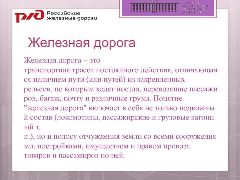Железная дорога – это транспортная трасса постоянного действия, отличающаяся наличием пути (или путей) из закрепленных рельсов, по которым ходят поезда, перевозящие пассажиров, багаж, почту и различные грузы. Понятие "железная дорога" включает в себя не только подвижный состав (локомотивы, пассажирские и грузовые вагонный т.п.), но и полосу отчуждения земли со всеми сооружениями, постройками, имуществом и правом провоза товаров и пассажиров по ней.