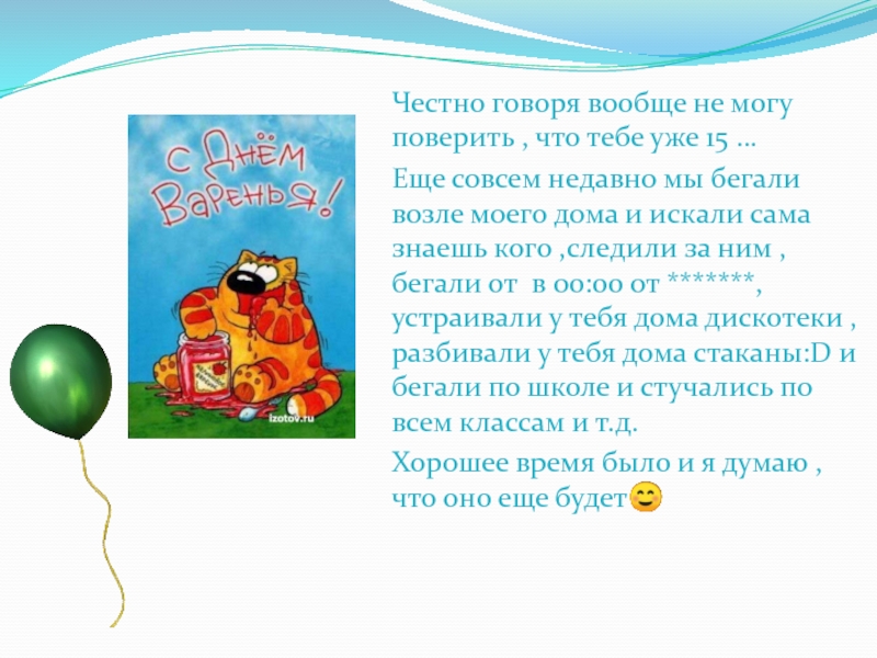 Честно говоря вообще не могу поверить , что тебе уже 15 …Еще совсем недавно мы бегали возле