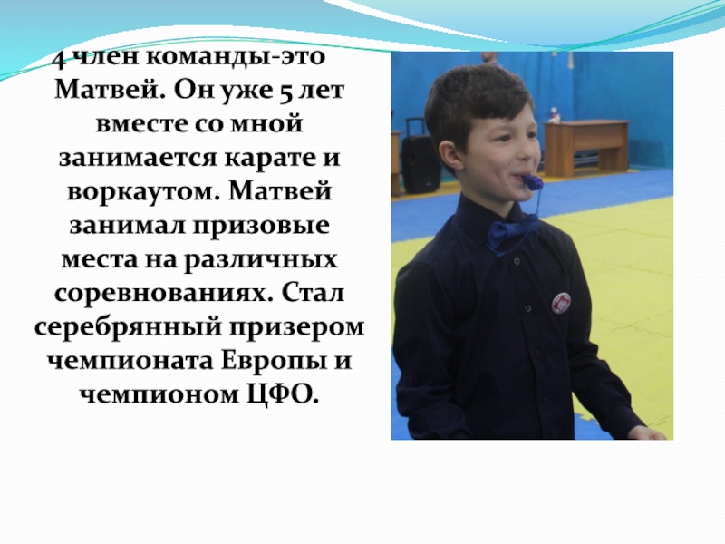 4 член команды-это Матвей. Он уже 5 лет вместе со мной занимается карате и воркаутом. Матвей занимал