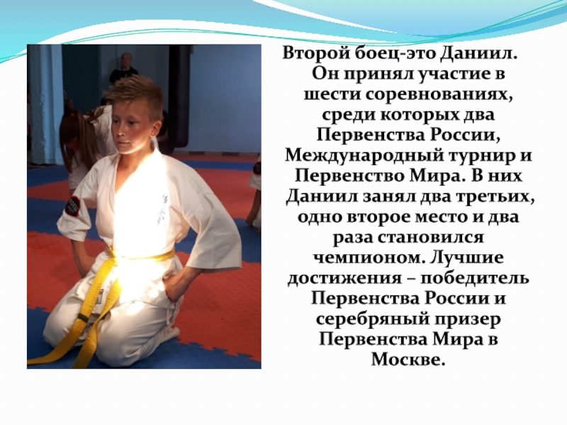 Слайд 4Второй боец-это Даниил. Он принял участие в шести соревнованиях, среди