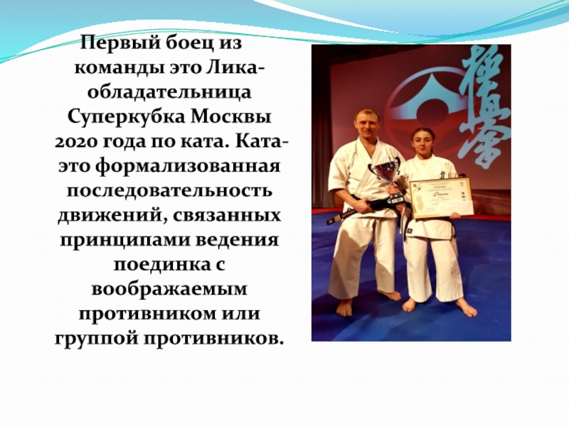 Первый боец из команды это Лика-обладательница Суперкубка Москвы 2020 года по ката. Ката-это формализованная последовательность движений, связанных