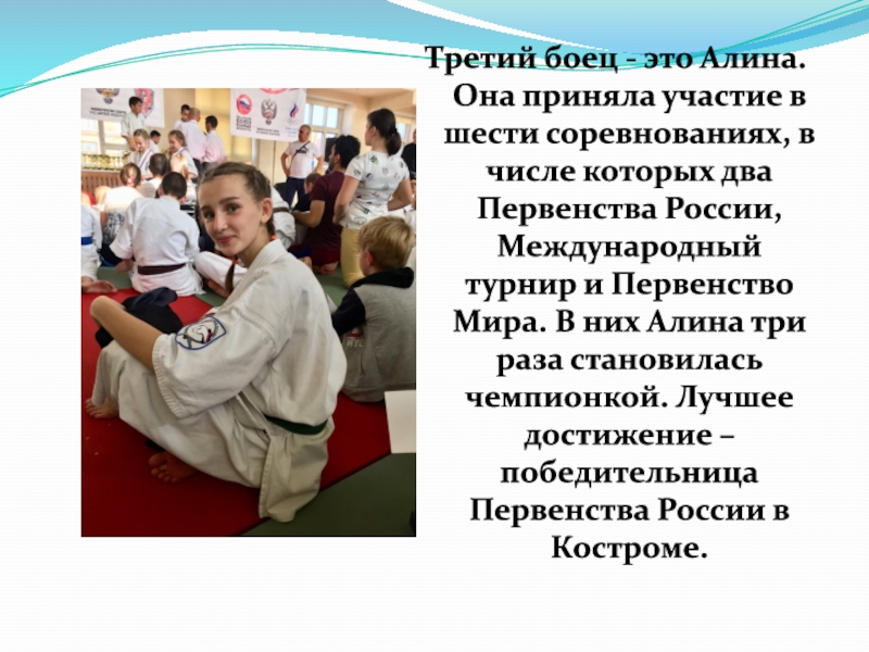 Слайд 5Третий боец - это Алина. Она приняла участие в шести