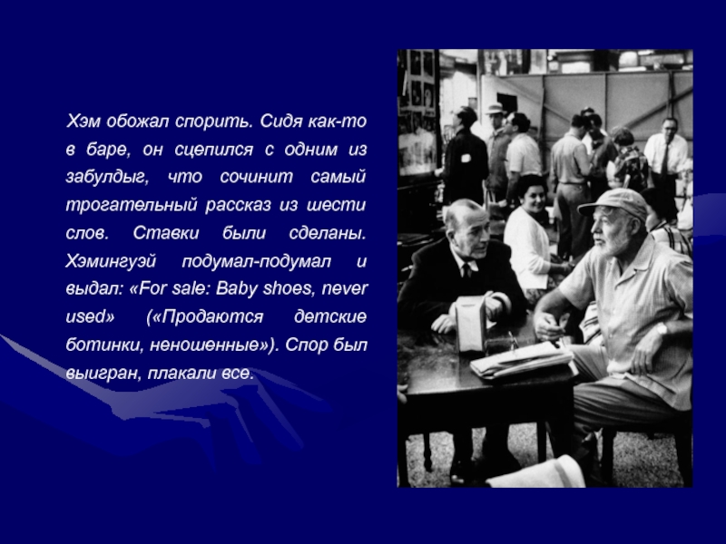 Слайд 9Хэм обожал спорить. Сидя как-то в баре, он сцепился с