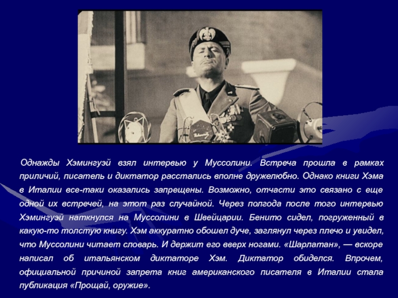 Слайд 6Однажды Хэмингуэй взял интервью у Муссолини. Встреча прошла в рамках