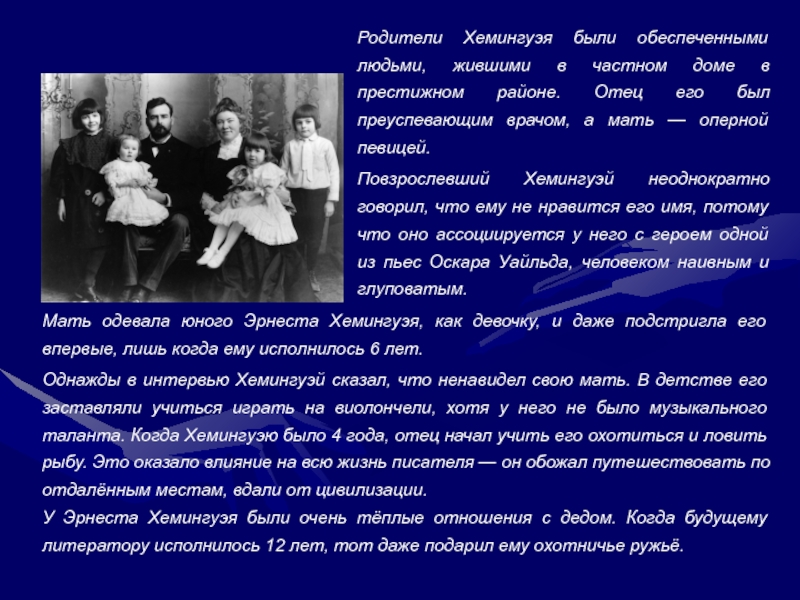 Слайд 4Родители Хемингуэя были обеспеченными людьми, жившими в частном доме в