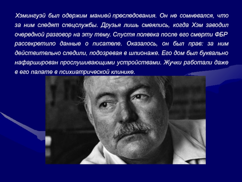 Слайд 5Хэмингуэй был одержим манией преследования. Он не сомневался, что за ним