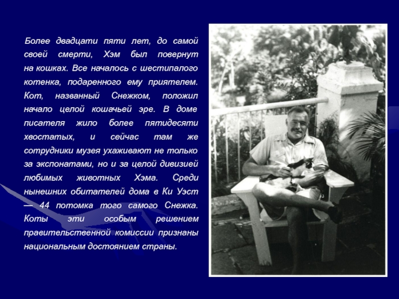 Кот, названный Снежком, положил начало целой кошачьей эре. В доме писателя жило более пятидесяти хвостатых, и сейчас там же сотрудники музея ухаживают не только за экспонатами, но и за целой дивизией любимых животных Хэма. Среди нынешних обитателей дома в Ки Уэст — 44 потомка того самого Снежка. Коты эти особым решением правительственной комиссии признаны национальным достоянием страны.