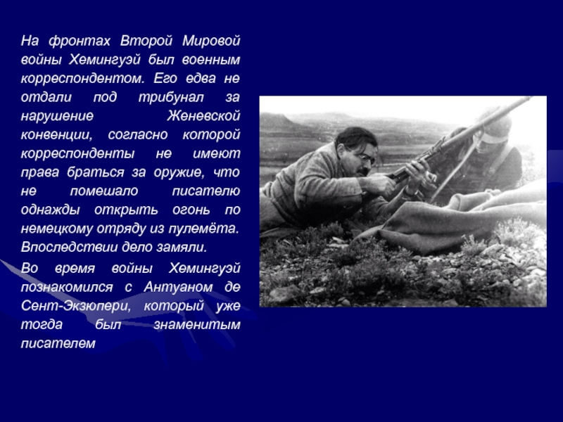 Слайд 12На фронтах Второй Мировой войны Хемингуэй был военным корреспондентом. Его