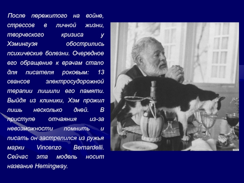 стало для писателя роковым: 13 сеансов электросудорожной терапии лишили его памяти. Выйдя из клиники, Хэм прожил лишь несколько дней. В приступе отчаяния из-за невозможности помнить и писать он застрелился из ружья марки Vincenzo Bernardelli. Сейчас эта модель носит название Hemingway.