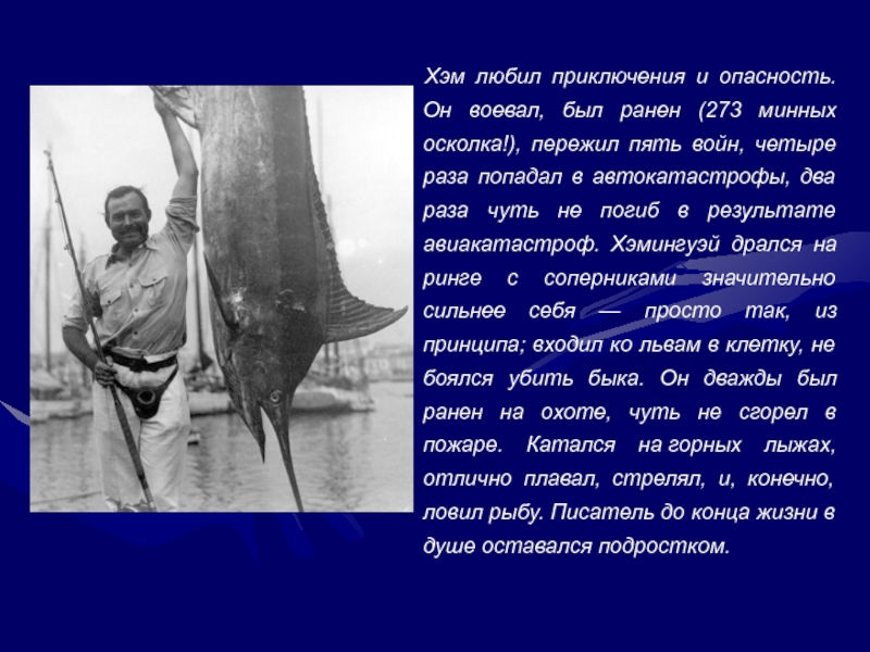 два раза чуть не погиб в результате авиакатастроф. Хэмингуэй дрался на ринге с соперниками значительно сильнее себя — просто так, из принципа; входил ко львам в клетку, не боялся убить быка. Он дважды был ранен на охоте, чуть не сгорел в пожаре. Катался на горных лыжах, отлично плавал, стрелял, и, конечно, ловил рыбу. Писатель до конца жизни в душе оставался подростком.