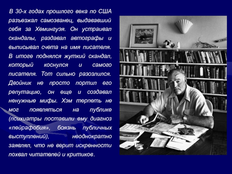 счета на имя писателя. В итоге поднялся жуткий скандал, который коснулся и самого писателя. Тот сильно разозлился. Двойник не просто портил его репутацию, он еще и создавал ненужные мифы. Хэм терпеть не мог появляться на публике (психиатры поставили ему диагноз «пейрафобия», боязнь публичных выступлений), неоднократно заявлял, что не верит искренности похвал читателей и критиков.