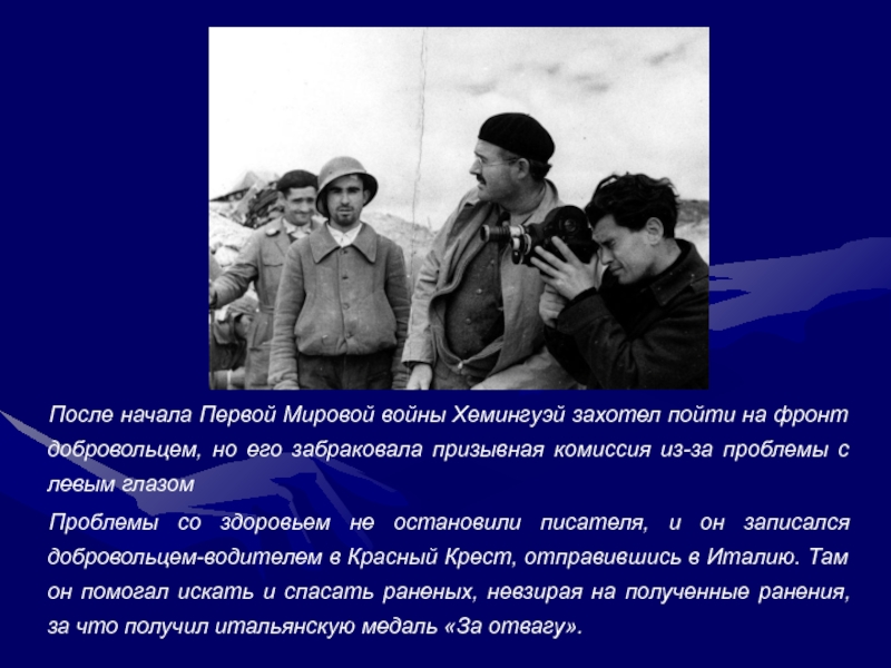 Слайд 11После начала Первой Мировой войны Хемингуэй захотел пойти на фронт