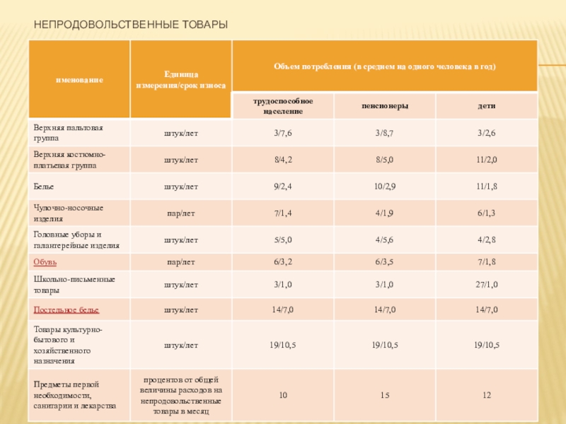 можно обойтись (шоколад, пирожные, деликатесы, алкоголь), а также предметы роскоши . Одежда, обувь, предметы длительного пользования (бытовая техника, мебель и др.) включаются в расчет исходя из годовой потребности, степени износа изделий.