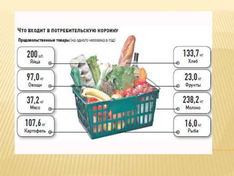 Слайд 13Ассортимент потребительской корзины россиянина включает 156 наименований товаров и услуг.